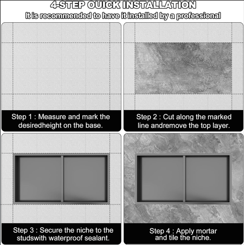 2) Easy Installation with No Tile Needed: This recessed shower niche comes fully finished and ready for installation, making it a convenient solution for your bathroom. No need for complicated processes or extra tools—simply insert it into the wall opening, use silicone sealant, and you're done. Its dimensions are designed to fit perfectly into your bathroom setup, whether vertically or horizontally.