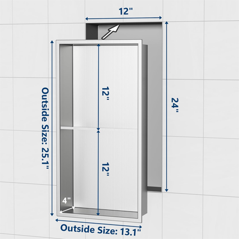 1) [Dimension]: Muschbath 12*24 inch stainless steel shower niche features a inner size 12" Width x 24" Height x 4" Depth and hem size 1.18 inch. Please make sure you measured the size before you install the niche.