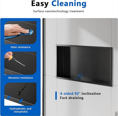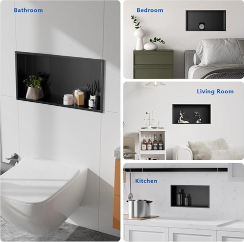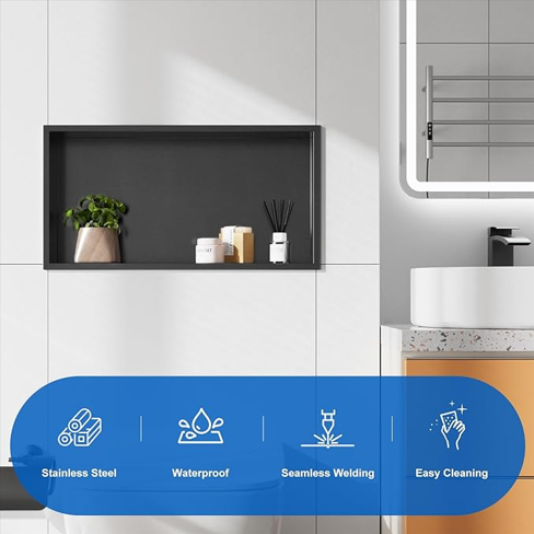 【No Tile Needed】 Stainless steel shower niches don't require tiles and complicated processes, they can be installed directly into wall openings with glue, saving you money, time and effort.