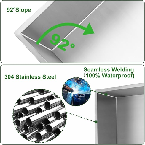 【Premium Construction】 Crafted from high-quality stainless steel, the LEXI Shower Niche offers exceptional durability and reliability. It is 100% leak-free, ensuring that your bathroom remains dry and free from water damage. The stainless steel material is resistant to corrosion and rust, making it ideal for wet environments such as bathroom