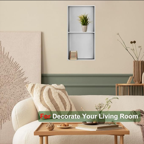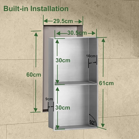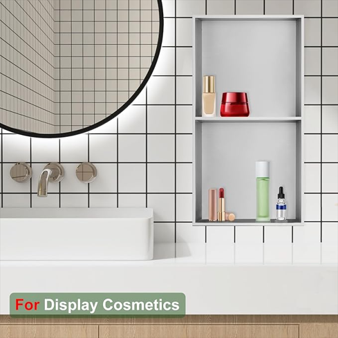 【Silver Wall Niche Size】Inner dimensions: 12"W x 24"H x 4"D. The wall niche has built-in 92° integrated drip slope for quick water drainage. Simply clean it with a wet cloth. The sleek Nano-Silver surface adds a touch of elegance to your shower space, enhancing the overall aesthetic appeal. It is also a Perfect storage in your bedroom, kitchen, living room, or shower room